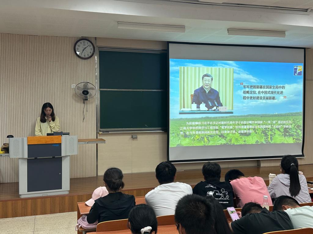 于一教1A410举办2024年暑期“实践归来话成长”信仰公开课。学院学工办主任兼分团委书记任学敏、2024级本科生辅导员孙慧、2024年暑期社会实践院级重点团队代表,2024级全体本科生参与本次活动,会议由学生会团委通讯社党婧琳主持。