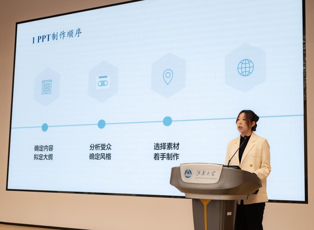 研究生会执行主席姜雨萌分享《如何让团学工作汇报表达更清晰:PPT制作技巧》,从制作顺序、框架结构、视觉效果、模板分享等多方面细致解剖PPT制作诀窍,为学生骨干后续工作汇报打下了坚实基础。