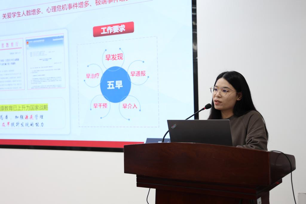 在教职工能力提升专题培训环节,产研院副科级干部薛华茂作横向科研工作交流,解析了在签订合同时需要关注的关键要素,介绍了横向科研项目的管理制度和政策导向,通过警示案例强调了在科技服务过程中应严格遵守法律法规,保障科研工作的健康有序发展。学生工作部心理健康教育中心专职教师、国家二级心理咨询师曾艳以《学生心理问题识别与早期干预》为题作指导,立足翔实的基础数据分析了当前心理工作的新挑战,对心理危机信号、识别途径、重要节点、心理问题预防举措等进行了普及和讲解,提高了参会教师对学生心理健康问题的认识,也为学院日常心理工作提供了具体的指导方案。