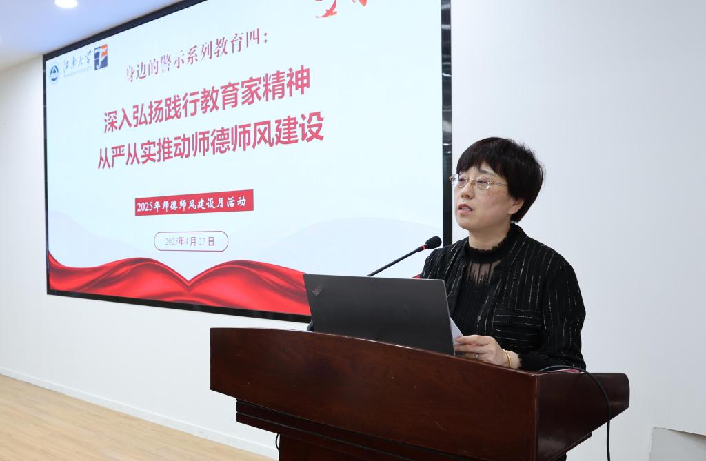 在教职工政治理论学习环节,学院党委书记张菁燕结合学校编印的学习材料作师德师风专题教育。重点对教育部公开曝光的违反教师职业行为十项准则典型案例、国家自然科学基金委员会监督委员会通报案例、校内警示教育案例等进行了宣读。她强调,师德师风是评价教师队伍的第一标准、影响学校教育改革发展事业成败,全院教职工应知准则守底线、知敬畏明戒惧,真正成为学生成长的引路人和“大先生”。
