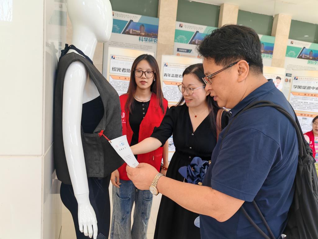 在科技成果展厅,服饰、医疗、军事等多领域的纺织科技产品依次陈列,双面织物、一体成型衣物、人造血管、防弹服、变色织物等前沿科技成果令新生眼前一亮。通过实物展示与专人讲解,新生直观感受到“问天探海,万物可织”的现代纺织魅力,增强专业自信心与认同感。