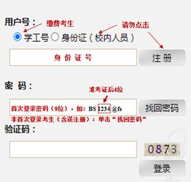 网上缴费平台”,完成缴费。考生账号已开通,切勿自行注册。收费标准:80元/生(仅申请考核考生,硕博连读考生无须缴费)。用户号在“学工号”输入正确的身份证号,初始密码(9位):“BS”+准考证编号后4位+“@fs”(准考证查看网址://yzgmis.hgsppro.com/zsgl/bswb/login.aspx),如“BS1234@fs”。非首次登录缴费系统的考生(含往年报考考生及误注册考生)请使用“找回密码”,登录并缴费。