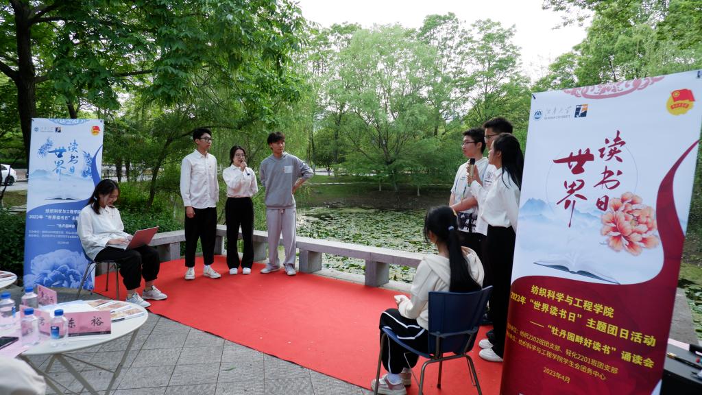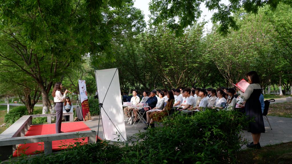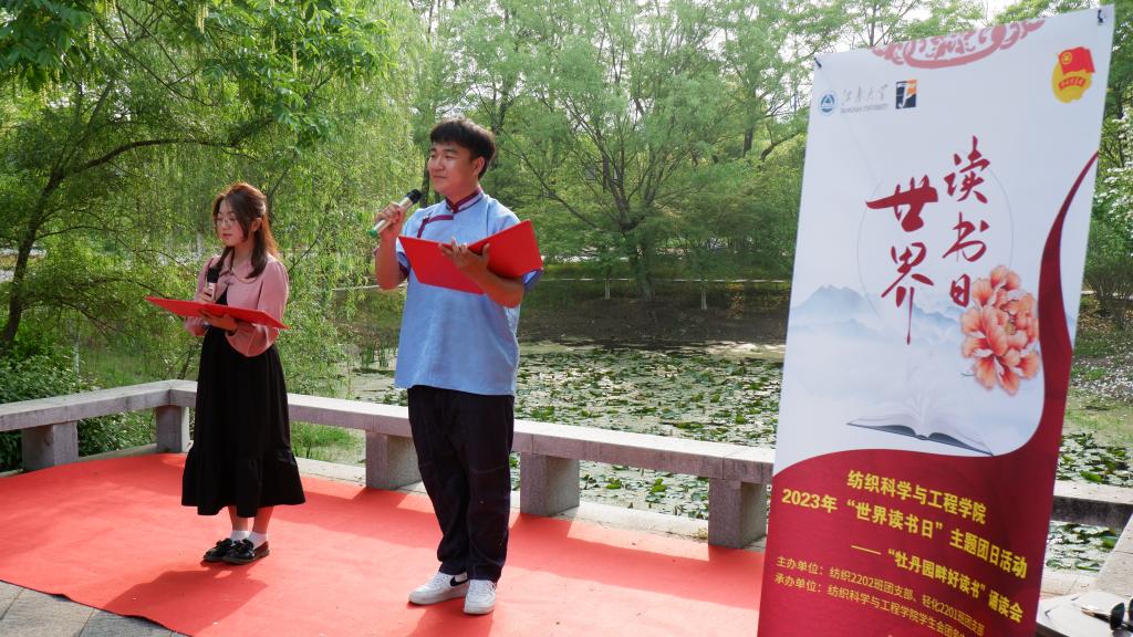 正是江南好风景,读书之乐乐陶陶。为深入学习贯彻党的二十大精神,纪念五四运动104周年,在第28世界读书日到来之际。419日下午,黄瓜视频 以基层团支部主题团日活动的形式,在学校牡丹园举办“牡丹园畔好读书”主题诵读会。黄瓜视频 关工委常务副主任袁伯兴,校团委副书记杨飏,黄瓜视频 党委副书记、副院长陈艳君,学校后勤管理处环境中心园艺花卉主管吴湘娟等,以及纺织2202班和轻化2201班的团员青年们参加诵读会,活动由纺织2202班团支部书记李子心主持。